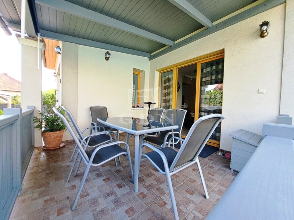 Az intim kert rendezett parkosított, két autó számára fedett autóbeálló áll rendelkezésre.A kert öntözését fúrt kút biztosítja.