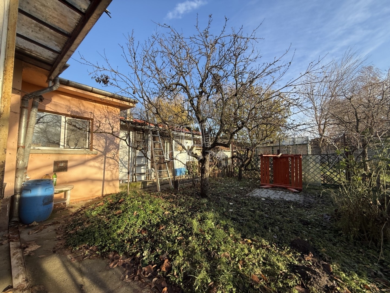 A telek körbekerített, található még egy garázs, és kb 40m2 melléképület. Az ingatlan az egyik utcafrontról személyi bejárattal rendelkezik, a másik oldalon gépkocsi bejárat és a garázs. Az udvar hátsó részén gazdasági épületek gyümölcsfák és veteményes található.